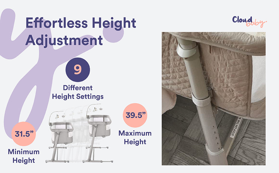 - 9 Height Positions: Our baby bed can adjust to 9 different height settings. The aluminum frame makes this pack n play bedside crib sturdy and lightweight. The dimensions are H39.50 x L35.04 x W28.35 inches and weighs 19.8 lbs