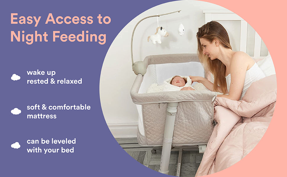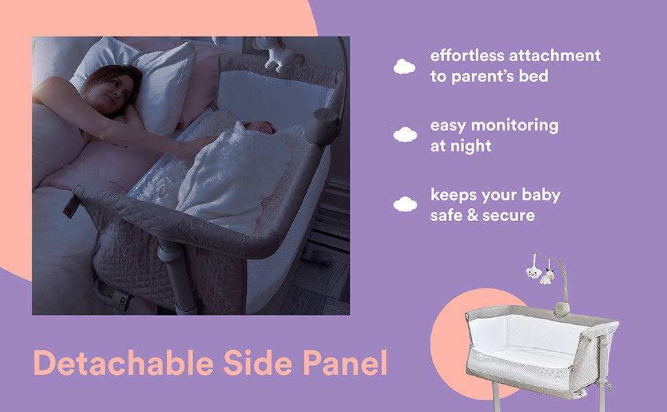 - Detachable Side Panel: Our bedside sleeper & baby cot has a double mesh detachable side, making it extra sturdy while providing plenty of air circulation. The bedside bassinet has a large clearance to accommodate a variety of bed shapes and sizes.